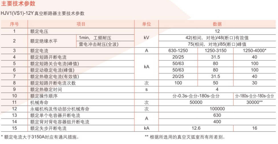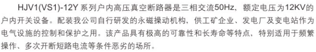 hjv1(vs1)-12y系列户内高压真空断路器是三相交流50hz,额定电压为12kv的户内开关设备。配装我公司自行研发的永磁操动机构,供工矿企业、发电厂及变电站作为电气设施的控制和保护之用。该产品具有极高的可靠性和长寿命等特点,特别适用于频繁操作、多次开断短路电流等条件恶劣的场所。