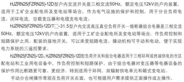 hjzrn25(fzn25)-12d、hjzrn25(fzrn25)-12d型负荷开关和组合电器适用于三相环网或终端供电的市区配电站和工业用电设备中,作负荷控制和短路保护。由于组合电器对变压器等电器设备的保护作用比断路更可靠、更经济、特别适用于环网,双辐射供电单元和箱式变电站。手动分合闸操作常规在负荷开关右面,也可根据用户需求提供正面操作或左操作。