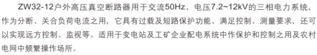 zw32-12户外高压真空断路器用于交流50hz、电压7.2~12kv的三相电力系统作为分断、关合负荷电流之用,它具有过载及短路保护功能、满足控制、测量要求,还可以实现远方控制、监视等。适用于变电站及工矿企业配电系统中作保护和控制之用及农村电网中频繁操作场所。